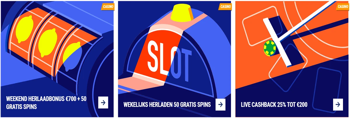 Wekelijkse promoties houden spelers betrokken. De Weekly Reload promotie biedt 50 gratis spins voor minimaal €20 storting tussen maandag en dinsdag.